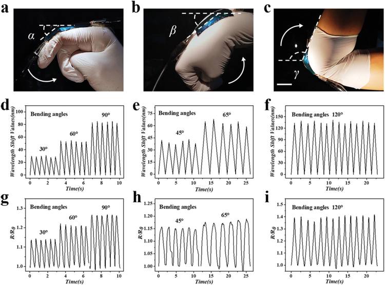 圖5 電導(dǎo)率對各種實(shí)時(shí)人體運(yùn)動的響應(yīng)。a-c)分別對a)手指、b)手腕和c)肘部的彎曲運(yùn)動響應(yīng)的聚合物導(dǎo)電水凝膠混合結(jié)構(gòu)色膜的照片。α、 β和γ分別表示手指、手腕和肘部彎曲運(yùn)動的彎曲角度。d-f)薄膜的波長偏移值,分別對應(yīng)于d)手指、e)手腕和f)肘部的不同彎曲角度。g-i)混合結(jié)構(gòu)色膜的相對電阻隨g)手指、h)手腕和i)肘部的不同角度而變化。