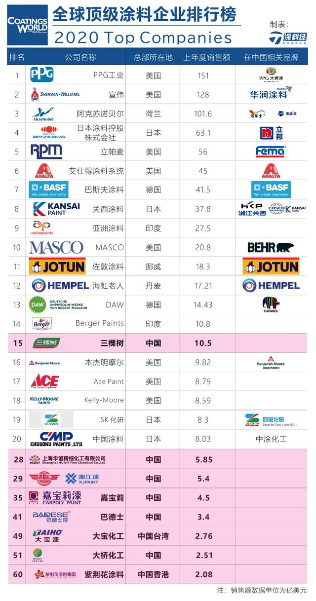 在中國涂料企業(yè)的表現(xiàn)方面,三棵樹憑借2019年度銷售業(yè)績的大幅增長,也使得排名得到大幅躍升,以10.5億美元的銷售額排名第15,成為首家躋身全球前20的中國涂料企業(yè);上海華誼精細化工有限公司(包含原上海涂料,簡稱華誼精化)以銷售額5.85億美元排名第28;湘江涂料以5.39億美元排第29名;嘉寶莉以4.50億美元位列第35;巴德士以3.4億美元列第41;大寶化工以2.76億美元列第49;大橋化工以2.51億美元列第51;紫荊花涂料集團以2.08億美元列第60。
