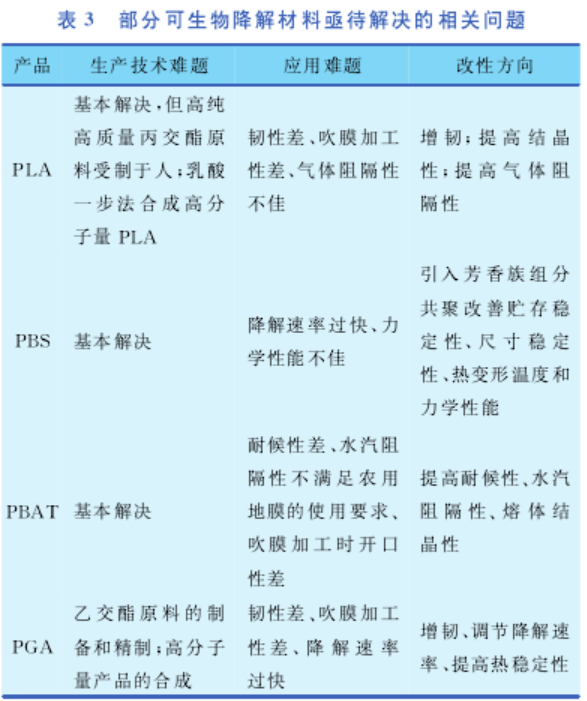 綜上所述,已商品化的 PLA 、PBAT/PBS 的市場(chǎng)前景最好。但是,若要大范圍替代現(xiàn)有通用塑料 PE ,不僅生產(chǎn)成本有待進(jìn)一步降低,而且有賴(lài)于一些問(wèn)題的妥善解決,即提高產(chǎn)品的“ PE特性”。另外,具有獨(dú)特性能的 PGA 的大規(guī)模應(yīng)用也有待相關(guān)問(wèn)題的解決。
